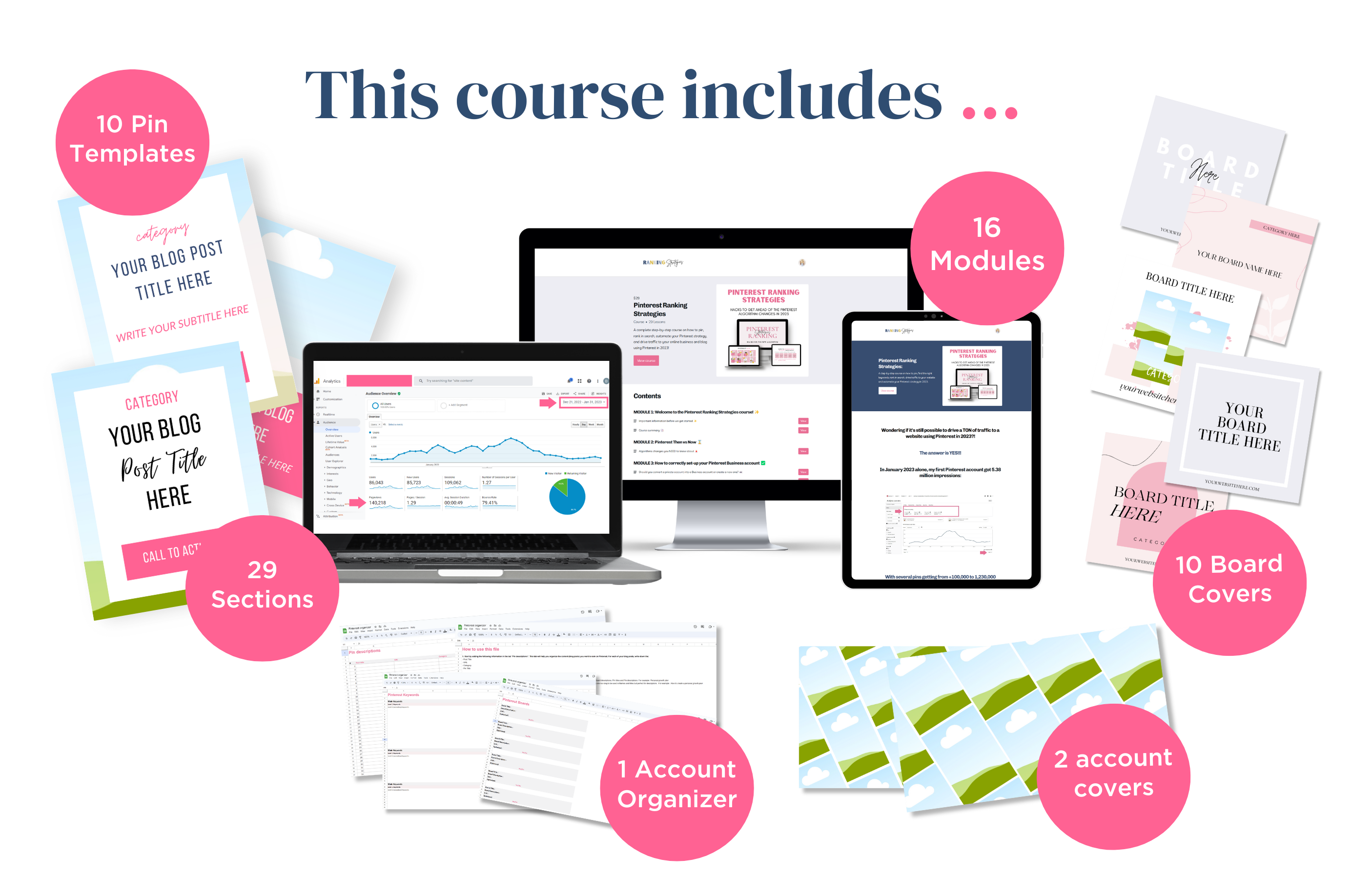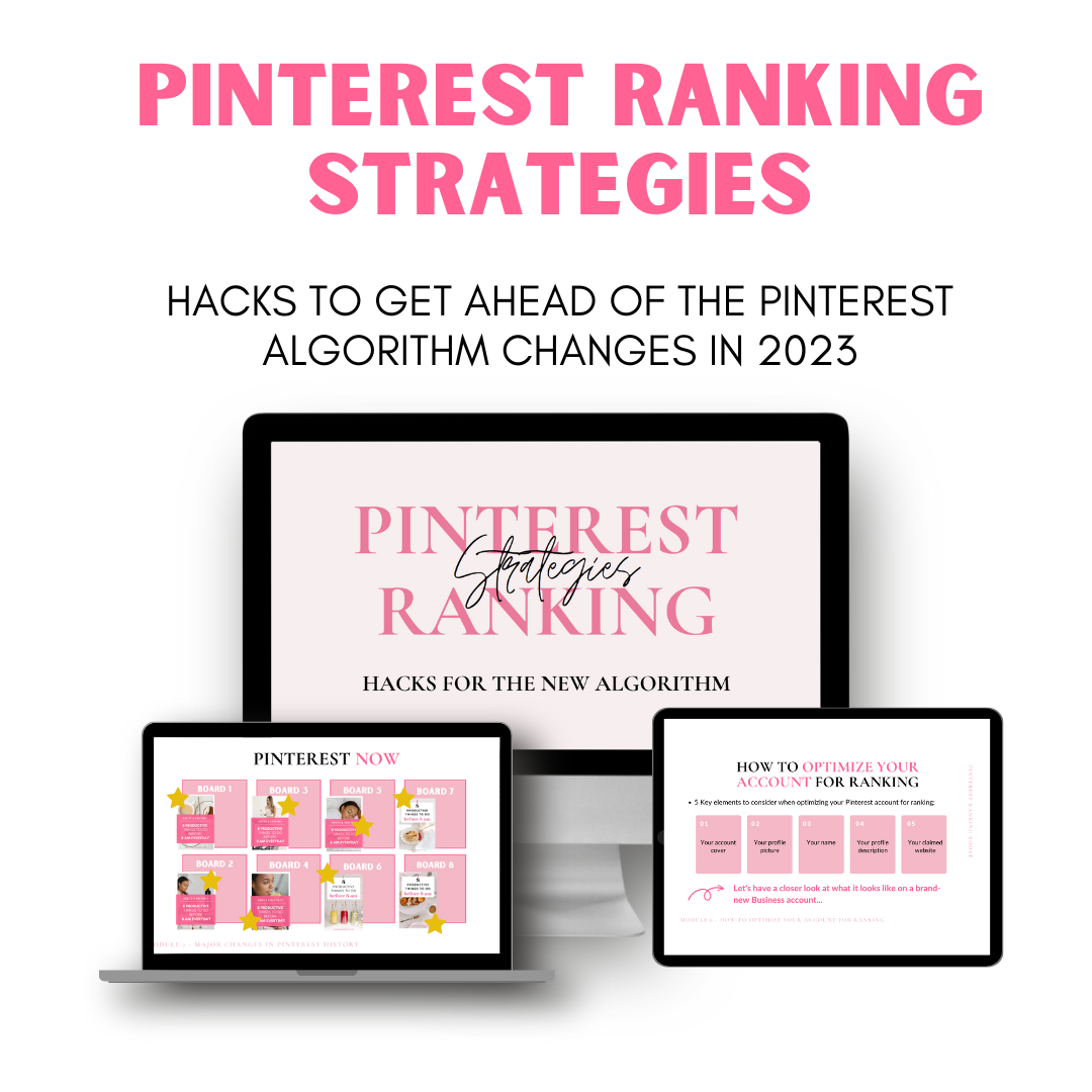 Pinterest Ranking Strategies is a 16-module course including +28 lessons covering everything you need to know to grow your Pinterest Business account and drive traffic to your website or blog. This course includes Google sheet templates and Canva templates to help you implement the strategies, save time and stay organized.