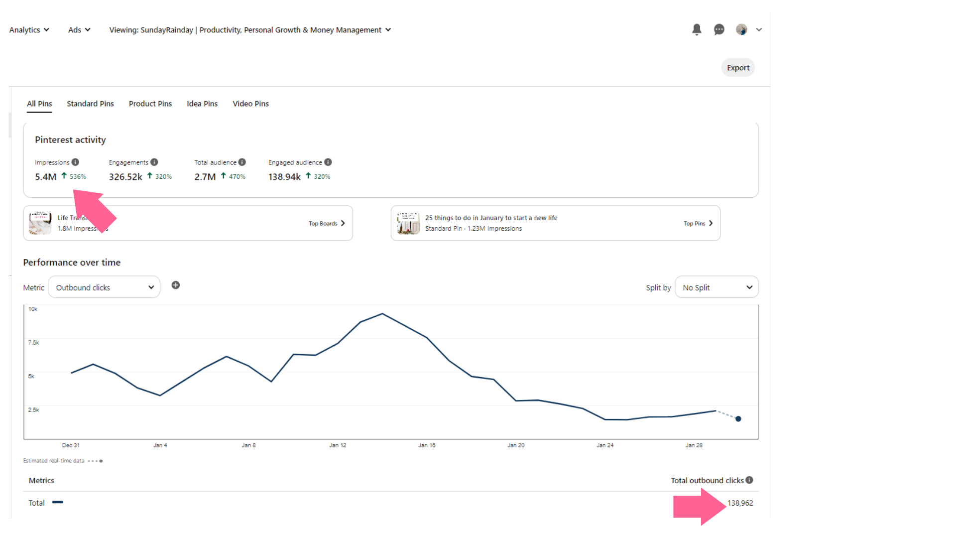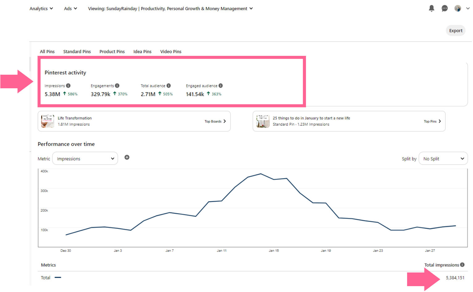 In January 2023 alone, my first Pinterest account got 5,384,151 impressions: