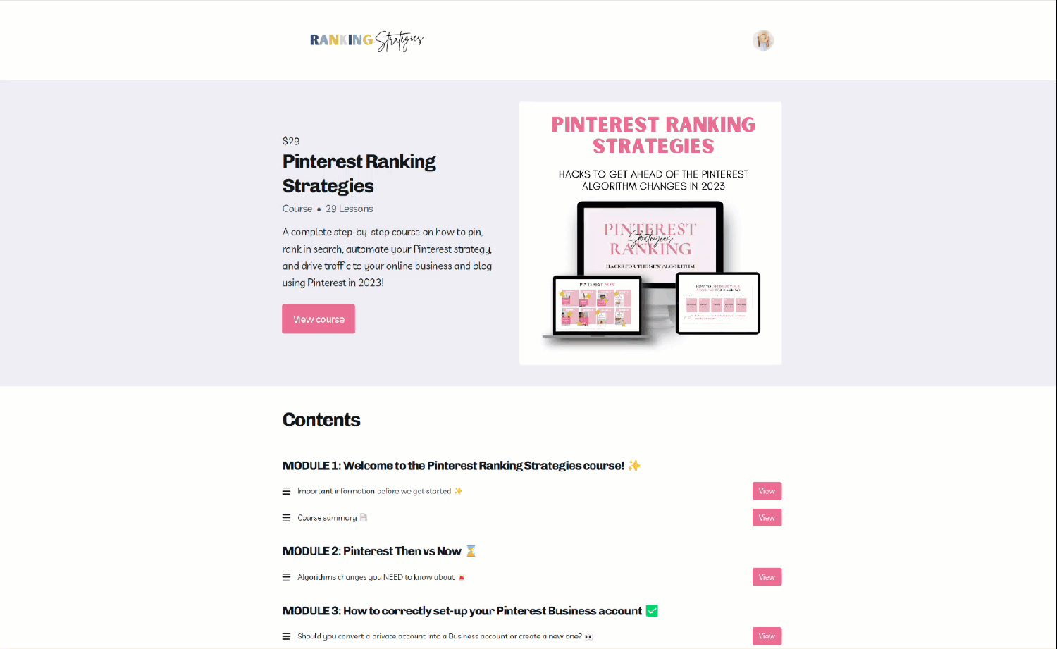 And this is where Pinterest Ranking Strategies comes in handy. This 16-module course will teach you everything you need to know to skyrocket your blog traffic using Pinterest in 2023.
